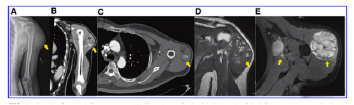 接受iPS细胞治疗患者的畸胎瘤。(A) 在左上臂的三角肌中,观察到一个圆形的混合密度肿块,边界不清,为9.6±5.2cm。(B) CT冠状扫描显示三角肌内有一圆形混合密度肿块,边界不清。(C)增强CT轴向扫描显示不均匀和中度强化。(D)MRI T1W以等信号为主,有不规则的高低信号区。(E) T2W也显示高信号和斑片状低信号区,左腋窝有多个淋巴结肿大。